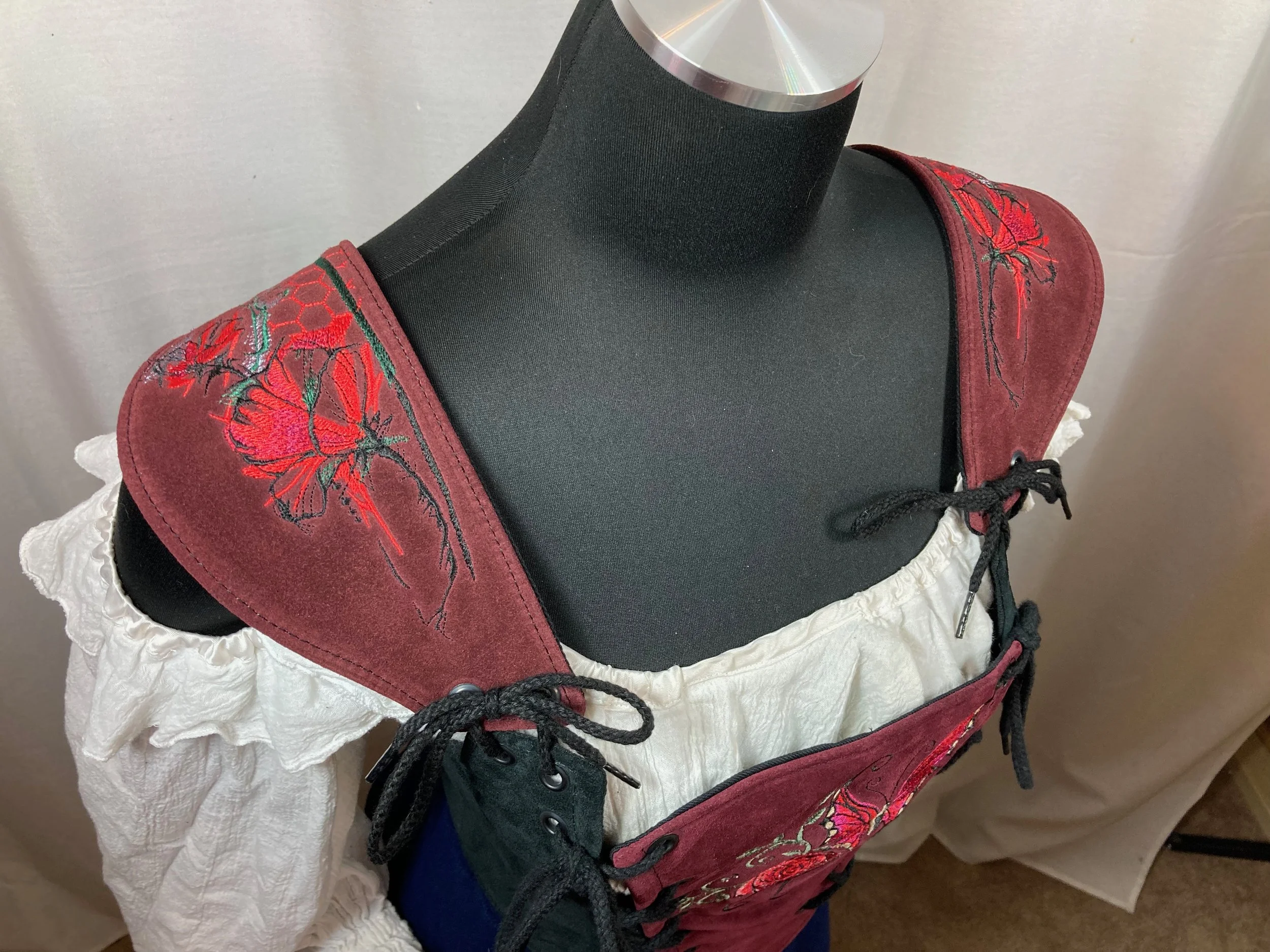 Embroidered suede stomacher and epaulette pieces lace into suede sides creating the bodice. Bodice sides determine size and can be ordered in larger or smaller sizes in the future should your size change.