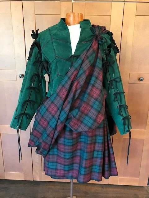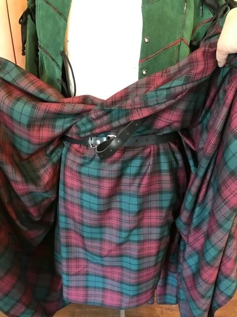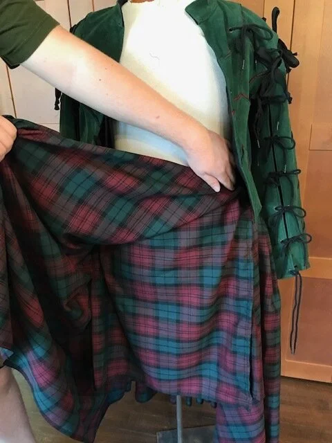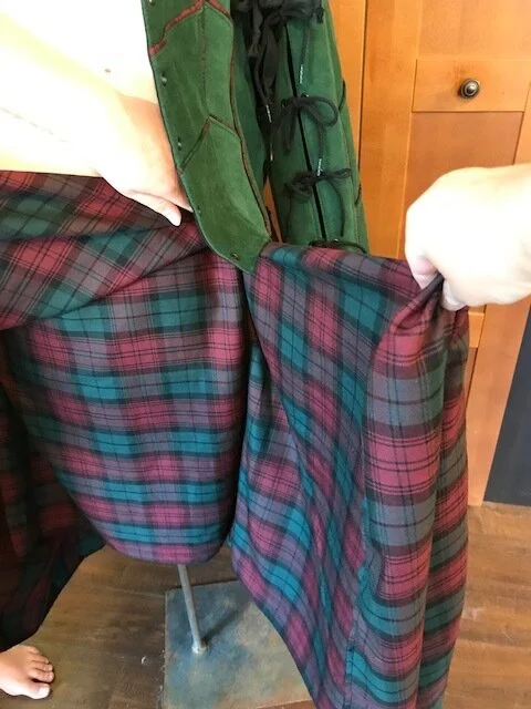 This is the tricky part: you need to lay this part flat across your front and you will be bringing the other side across from the left to the right ON TOP of this piece, BUT UNDER the top half of the other side of the kilt. (when I put it on the mannequin, I will often throw the top half of the right side of the kilt over the mannequin’s “head”. If you have a person nearby , you could have them hold it for you. This is the main reason some people will tell you have have to be lying down to properly put on a kilt.)