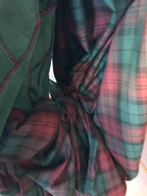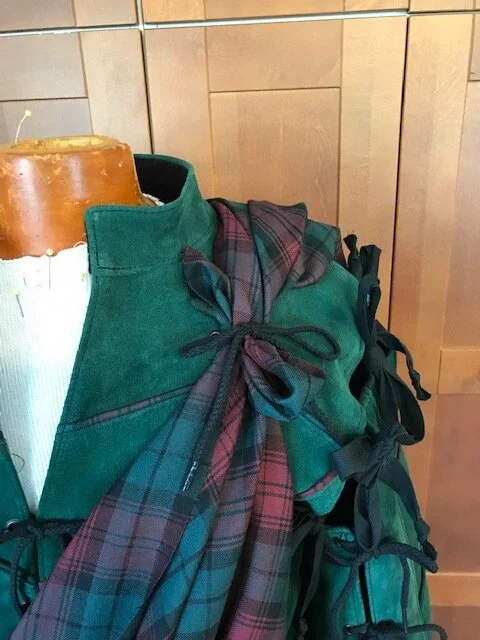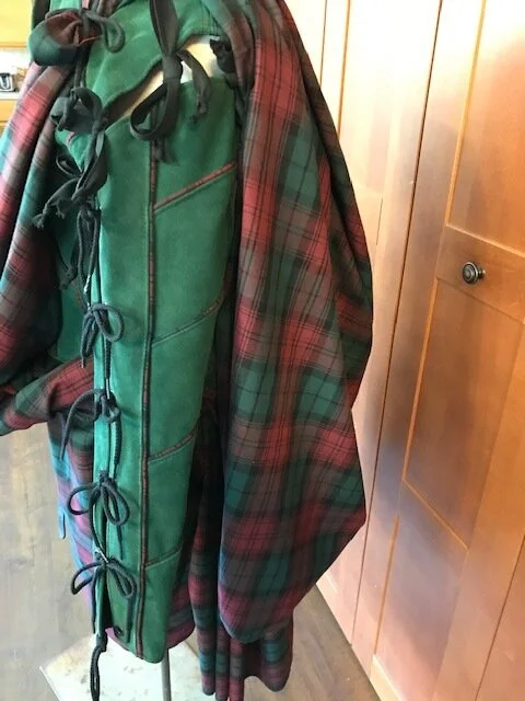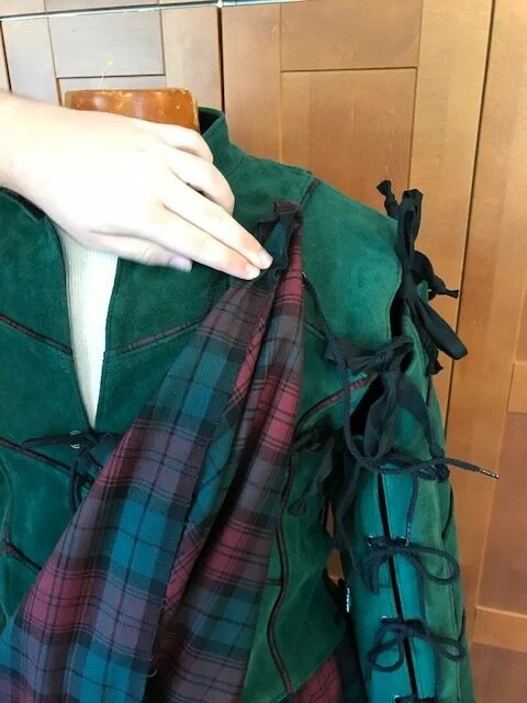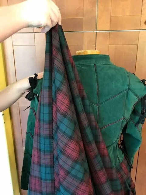 So now you will be following the line of the plaid from the point where it is sewn to the kilt out to the left side’s front edge.